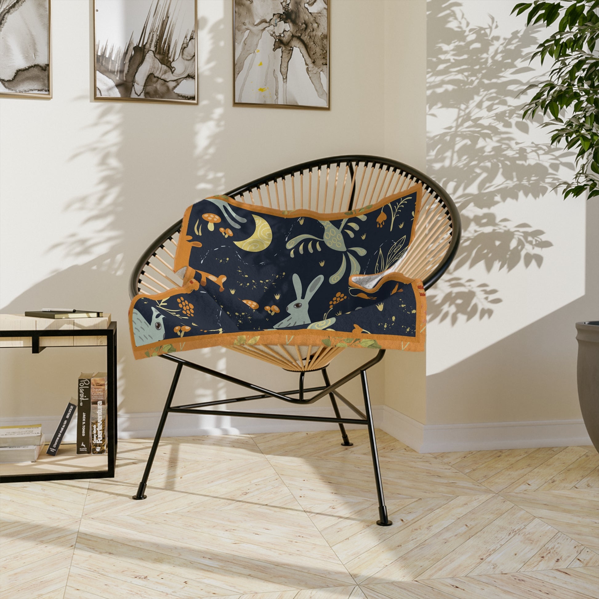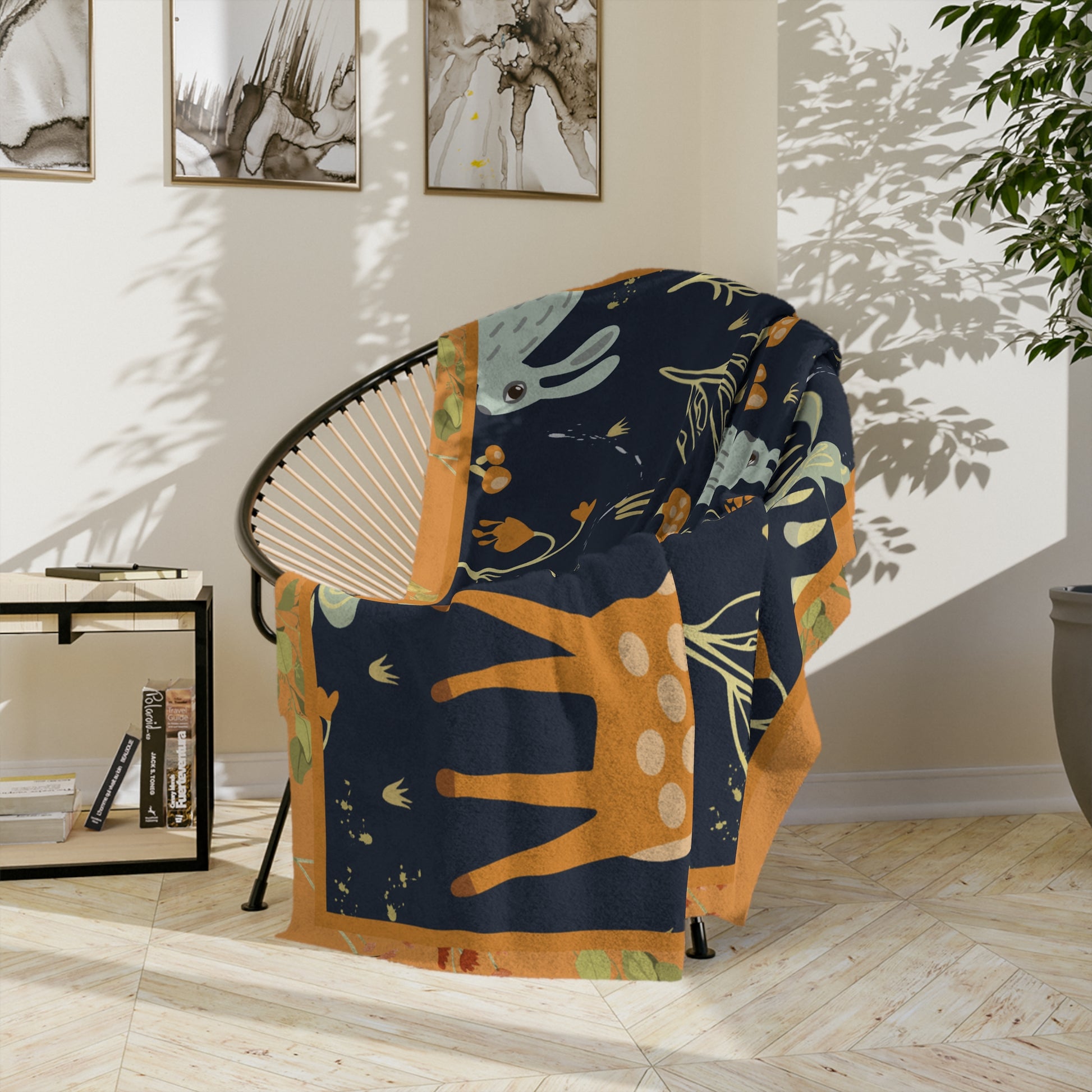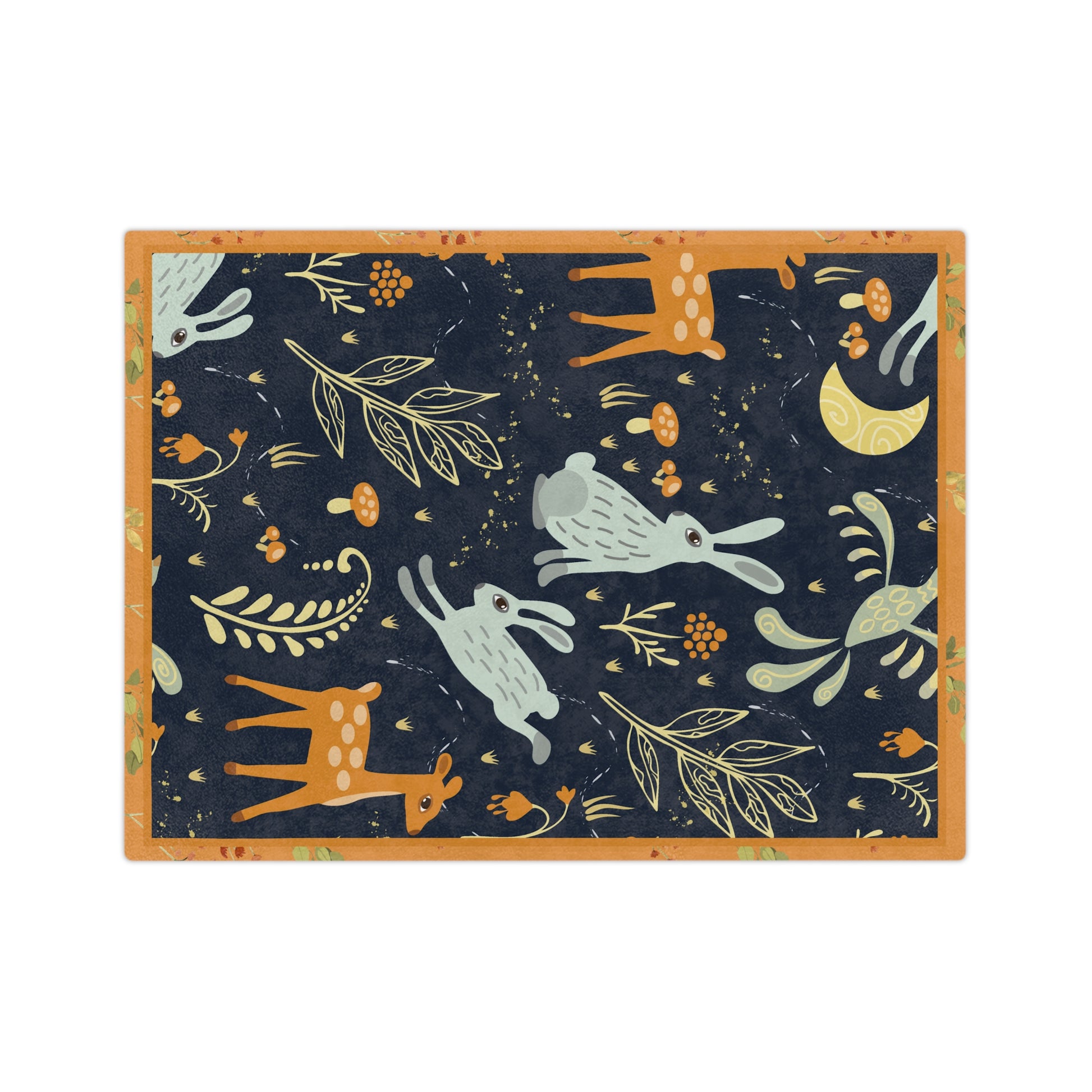 Wrap yourself in a quiet, storybook night. This velveteen microfiber blanket features soft, plush fabric printed with moonlit hares, gentle fawns, and whimsical foliage in warm orange and deep navy tones. It feels like a cozy hush—lightweight enough to carry to the porch, substantial enough to curl under on the couch. The stitched 2" hem and sewn edges give it a neat finish that wears well through evenings of reading, movie nights, or slow autumn mornings. Bring a touch of woodland calm to nap time, nursery corners, or a layered bedspread.