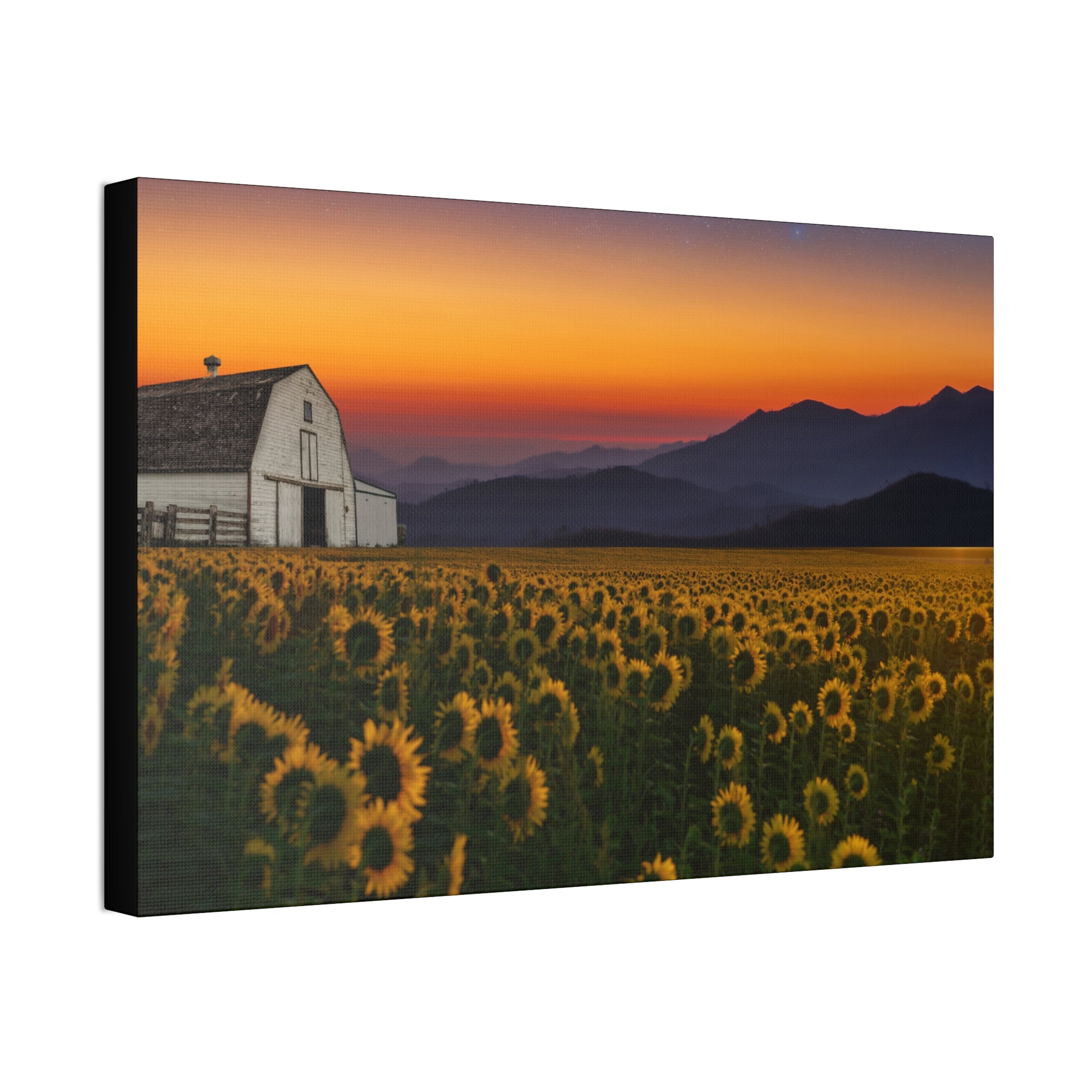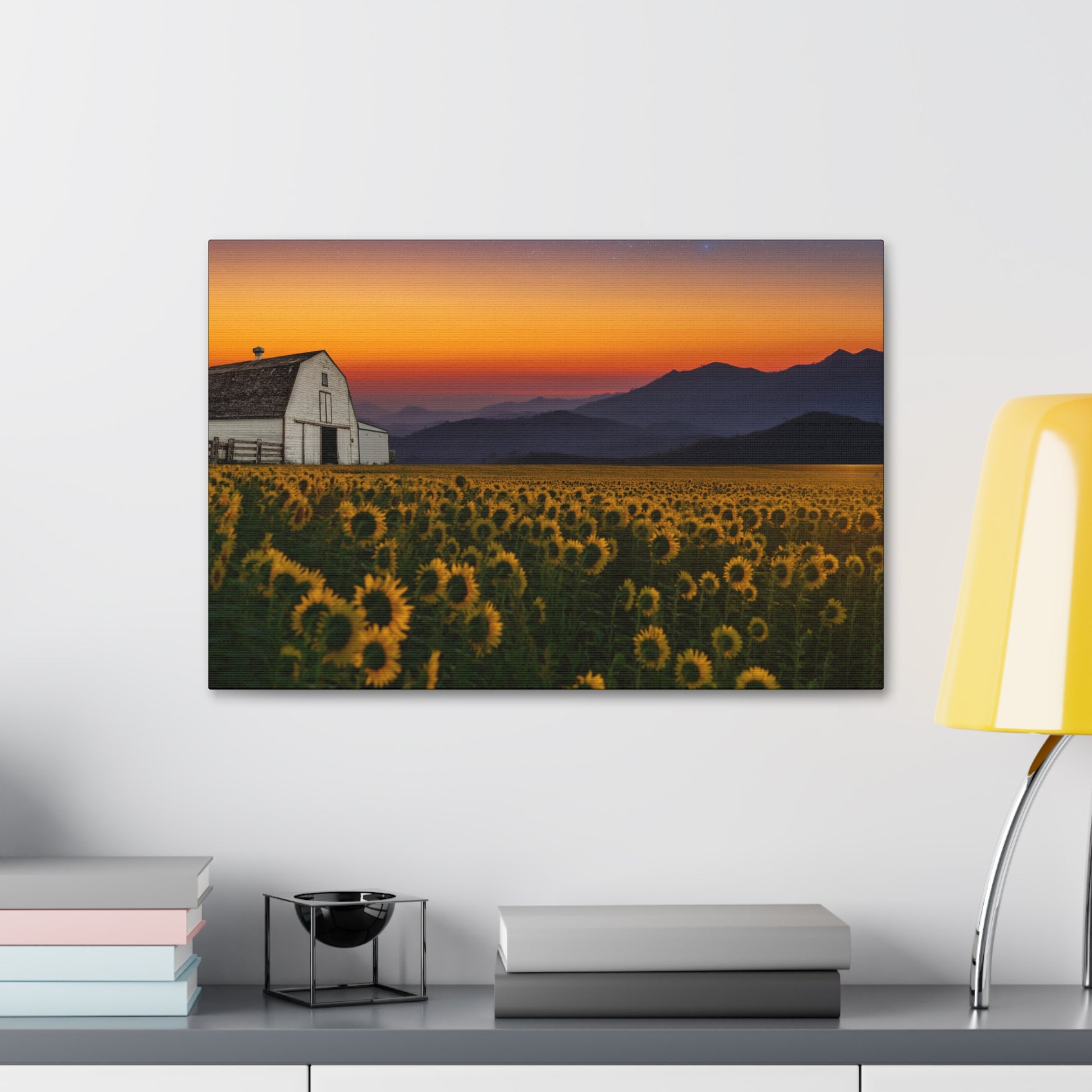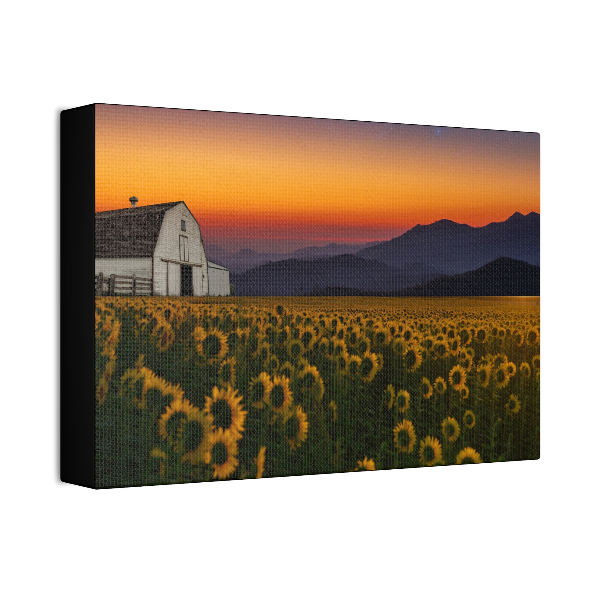 A stretched canvas print that brings a quiet, golden dusk into any room. The image of a sunflower field with a white barn against rolling mountains and a burnished sunset is printed on heavy-weight polyester and hand-stretched over a 1.5" pine frame. Colors stay vivid with a semi-gloss finish that catches the light without glare, and the included mounting hardware makes it simple to hang the piece horizontally, vertically, or square depending on your space. Small QR codes on the back link to care and provenance details. Assembled in the USA from globally sourced parts, this canvas adds a warm, rustic-focus moment to living rooms, entryways, or cozy nooks.