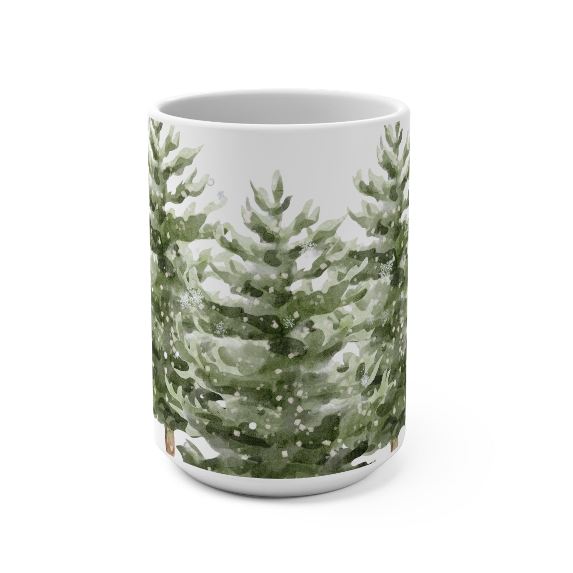 Winter Deer Mug — 15oz Holiday Pine Forest Ceramic Cup for Tea or Coffee- Part of the Winter Series